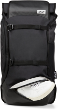 Batoh od značky AEVOR, model Travel Pack. Hlavní specialitou batohu je límec, díky kterému můžete zvětšit nebo zmenšit kapacitu batohu (od 38 do 45 litrů). Mezi hlavní prvky batohu patří voděodpudivý materiál. Batoh dále nabízí hlavní komoru se zapínáním na suchý zip - uvnitř vyztuženou přihrádku na notebook o max. rozměrech cca 39 x 27 x 3 cm (15 palců) a síťovanou kapsu na zip, vstup do batohu je možný také ze zadní strany díky dvoucestnému zipu. Na batohu dále nechybí boční kapsa na zip (uvnitř dvě síťované přihrádky), boční síťovaná přihrádka, zadní zipová kapsička, horní zipová kapsička na brýle, dva přední strepy vhodné pro upevnění skateboardu či oblečení. Samozřejmostí je potom vyztužený zádový panel, výškově nastavitelné ramenní popruhy s hrudním pásem, odepínatelný bederní pás a poutko pro lepší přenos a manipulaci. Kapacita batohu je 38 - 45 L, rozměry cca 58 x 34 x 20 cm a materiál: 50% recyklovaný polyester, 50% polyester.