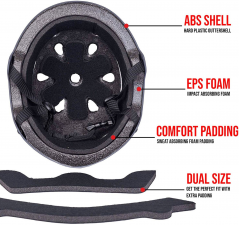 Helma od značky CORE Protection, model BASIC HELMET je helma určená pro všechny sporty, je lehká a pevná, poskytující maximální ochranu, konstruována pro zmírnění účinku nárazu a omezení možnosti zranění při jízdě. Skořepina helmy je z vysoce odolného ABS materiálu. Uvnitř je odnímatelné polstrování, které se přizpůsobí tvaru hlavy a pár větracích otvorů. (Helma splňuje veškeré normy týkající se helem pro skateboarding - CE EN 1078).