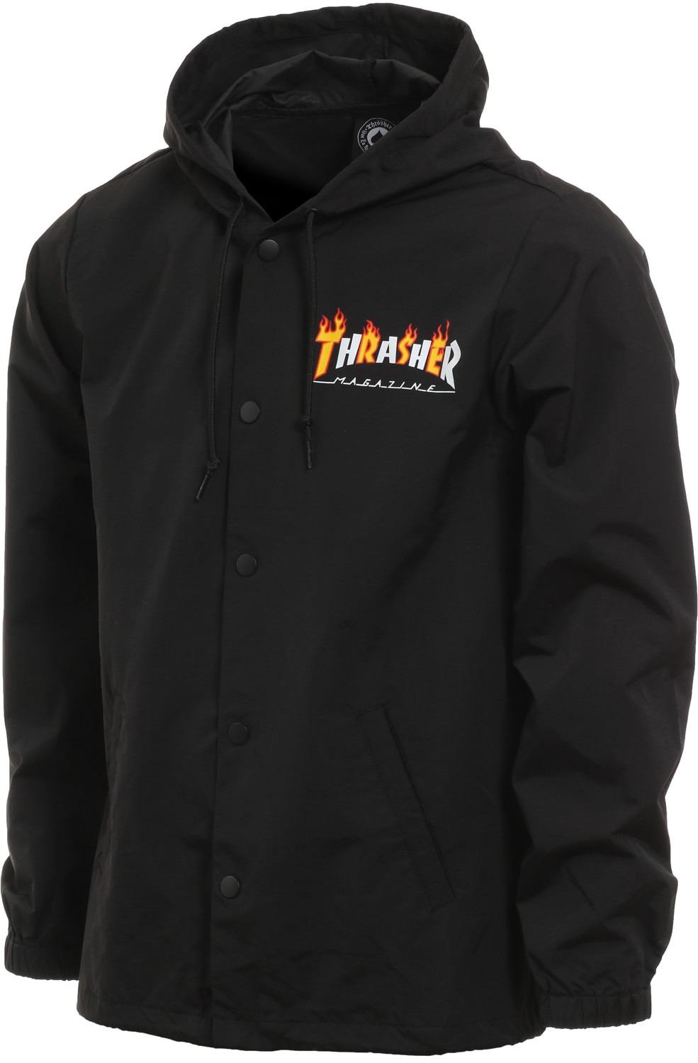 Pánská bunda Thrasher Magazine Flame Mag - moderní coach jacket (bunda na knoflíky s límečkem) - příjemný tenký materiál, v přední části dvě kapsy, tenká podšívka, kapuca stahovatelná tkaničkou, kombinace legendárního Flame loga a Skate Mag loga na prsou. Materiál 100% nylon.