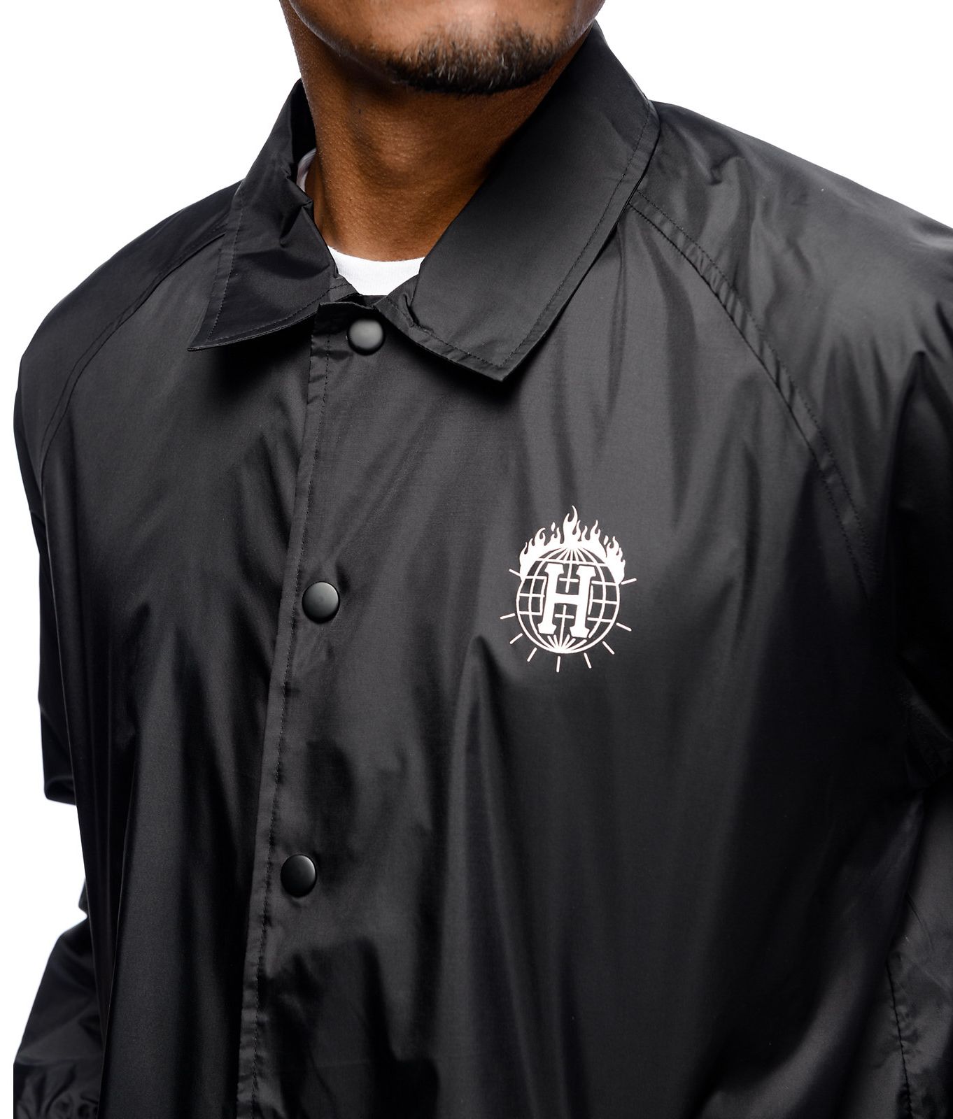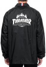 Pánská bunda Thrasher x Huf Coach Jacket z kolaborace Tour De Stoops - moderní coach jacket střih - zapínání na knoflíky, límeček, lehčí podšívka, v přední části dvě volně dostupné kapsy. Potisk v přední i zadní části bundy. Detaily bundy v barvách franzcouzské vlajky.
