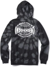 Mikina Primitive Skateboards x Independent, model Global Washed je součástí spolupráce značky Primitive Skateboards s legendárním skejtovým brandem Independent. Příjemná klokanka s lehčí fleece podšívkou. V přední části velká volně dostupná kapsa, kapuce stahovatelná tkaničkou, stylový batikovaný wash design s designem kolaborace tištěný na hrudi a zádech. Materiál: 80% bavlna, 20% polyester.
