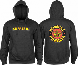 Pánská mikina od značky POWELL PERALTA, model SUPREME. Stylová klasická klokanka s velkou volně dostupnou přední kapsou. Kapuce stahovatelná tkaničkou. Velký potisk na zadní straně mikiny, menší potisk na přední straně - na prsou. Příjemný tenčí materiál označovaný jako medium weight - 80% bavlna, 20% polyester.