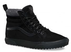 Pánské kotníkové boty značky Vans model SK8-HI MTE, inspirované old school módou, povrch boty je z černé jemné broušené kůže s textilními detaily, kulaté tkaničky, kovové kroužky pro snadné šněrování, poutka na patě, logo Vans na jazyku, Vans kožený pruh na boku, zpevněná pata a špička, podšívka je zateplená od kotníků k patě, kvalitní izolace, protiskluzová a pevná podrážka se vzorem ,,waffle,,.